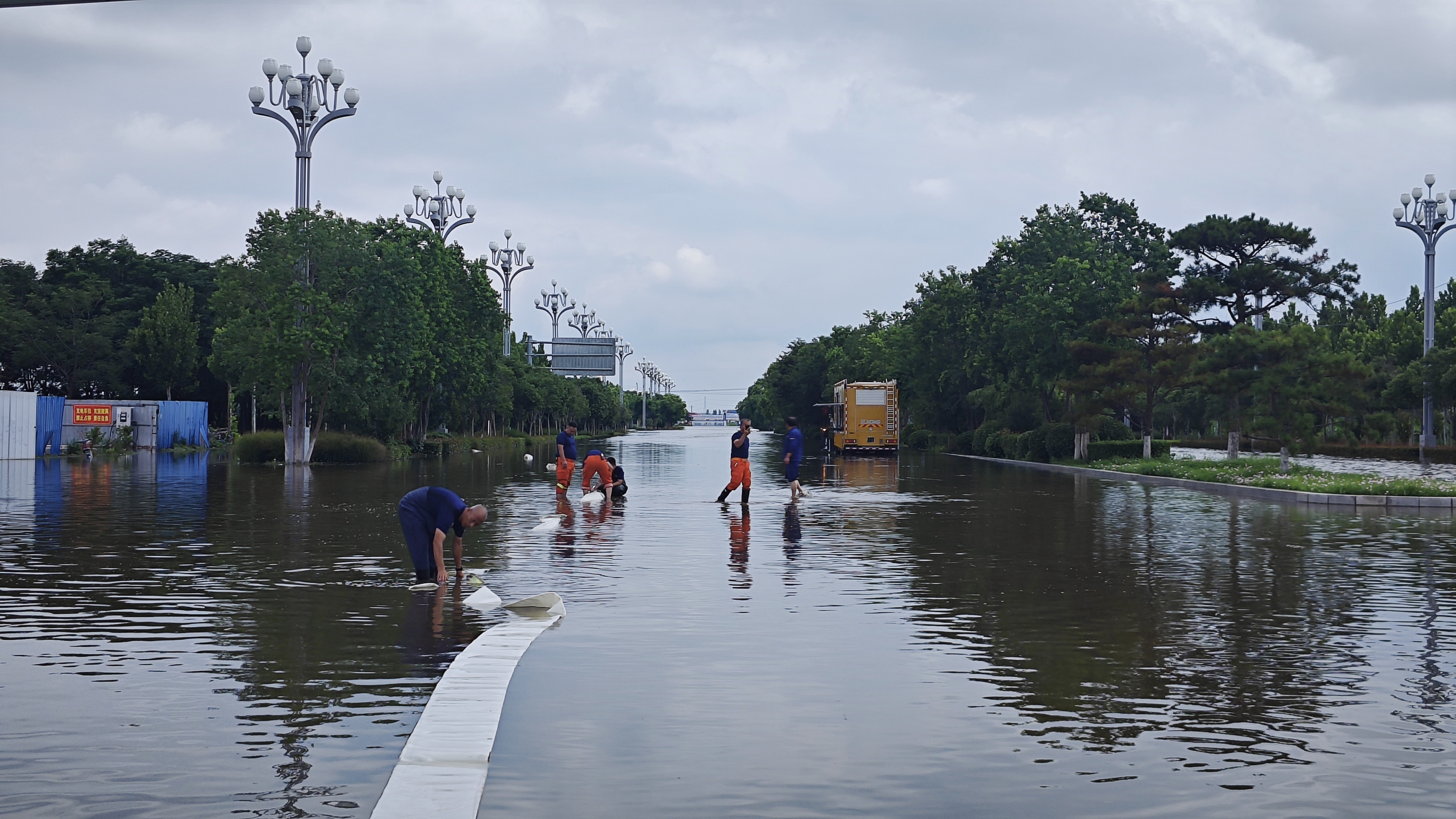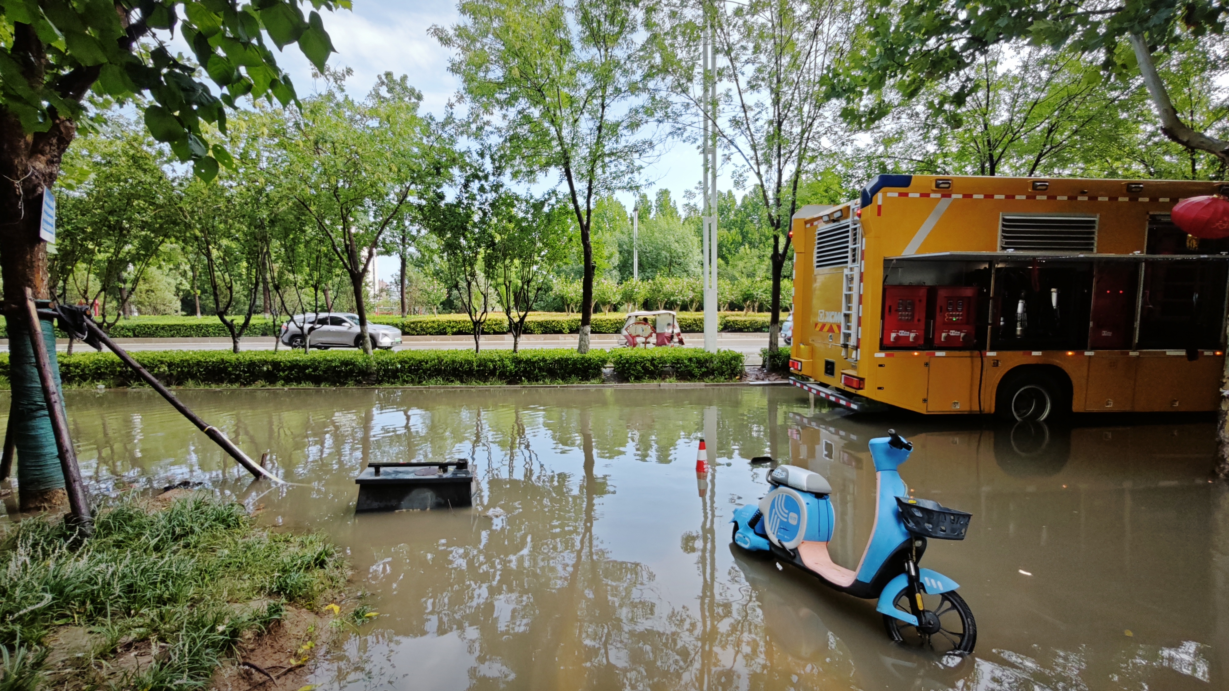 華商大道同屬商丘市睢陽區(qū),此處靠近河堤,周邊道路積水均向此處轉移,交通主干道被積水淹沒,影響城市正常通行。