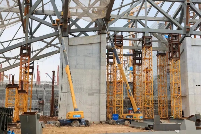 忙碌的工地上,隨處可見“徐工金”辛勞的身影。此次參與施工的有四十余臺(tái)徐工高空作業(yè)平臺(tái),高度從22米到40米不等,主要負(fù)責(zé)場(chǎng)館鋼結(jié)構(gòu)的安裝工作。