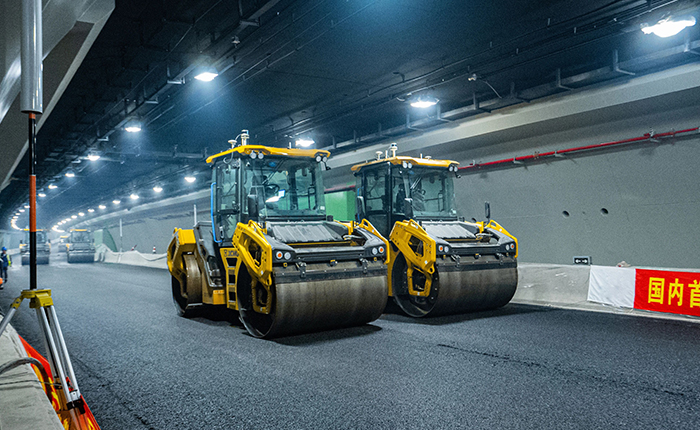 此次隧道路面鋪設(shè)工藝,是國內(nèi)首次在城市低空長隧道中進(jìn)行無人攤鋪、壓實(shí)新工藝應(yīng)用。鋪筑后路面密實(shí)度達(dá)99.9%,平整度比傳統(tǒng)提升20%,滲水構(gòu)造深度達(dá)100%。