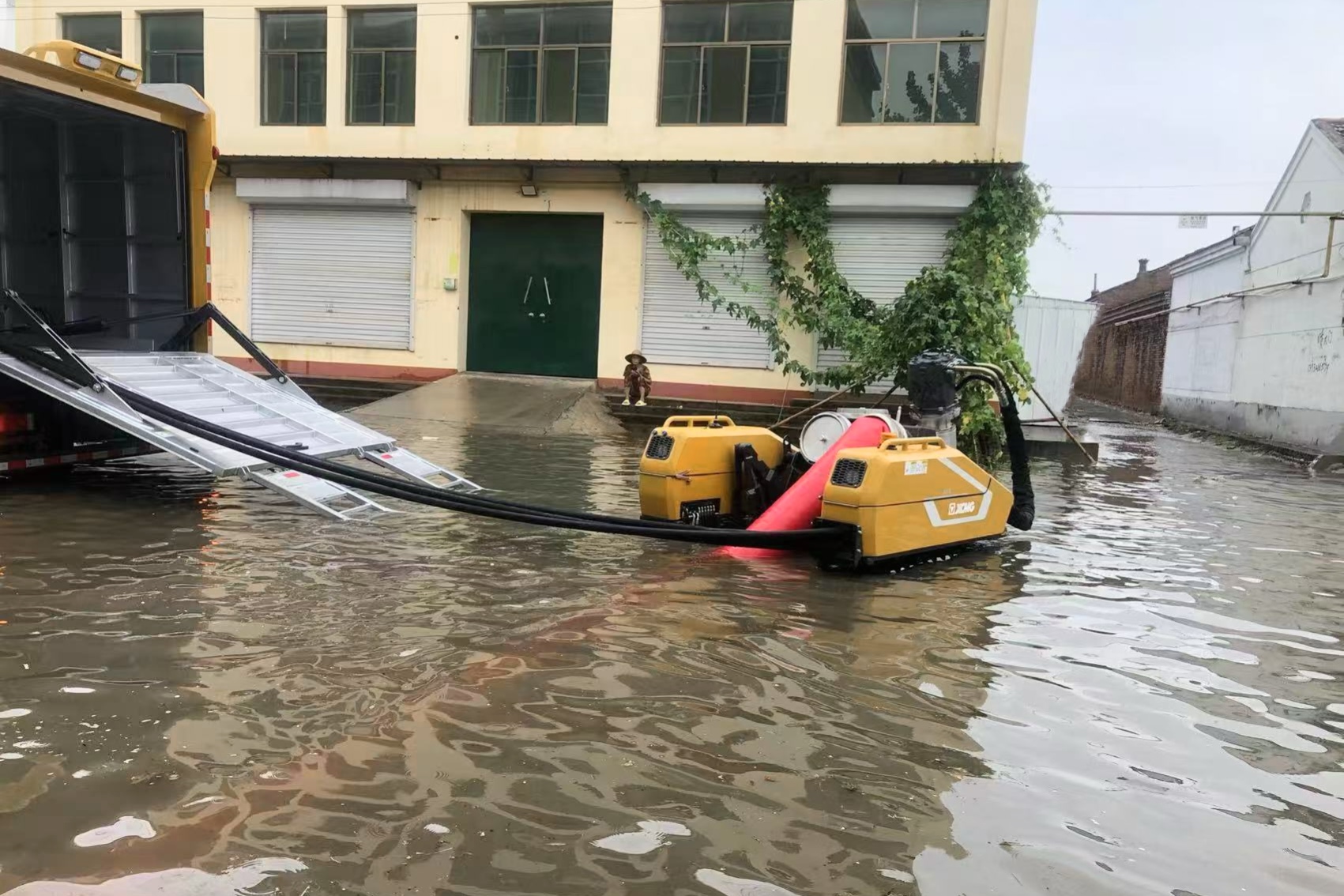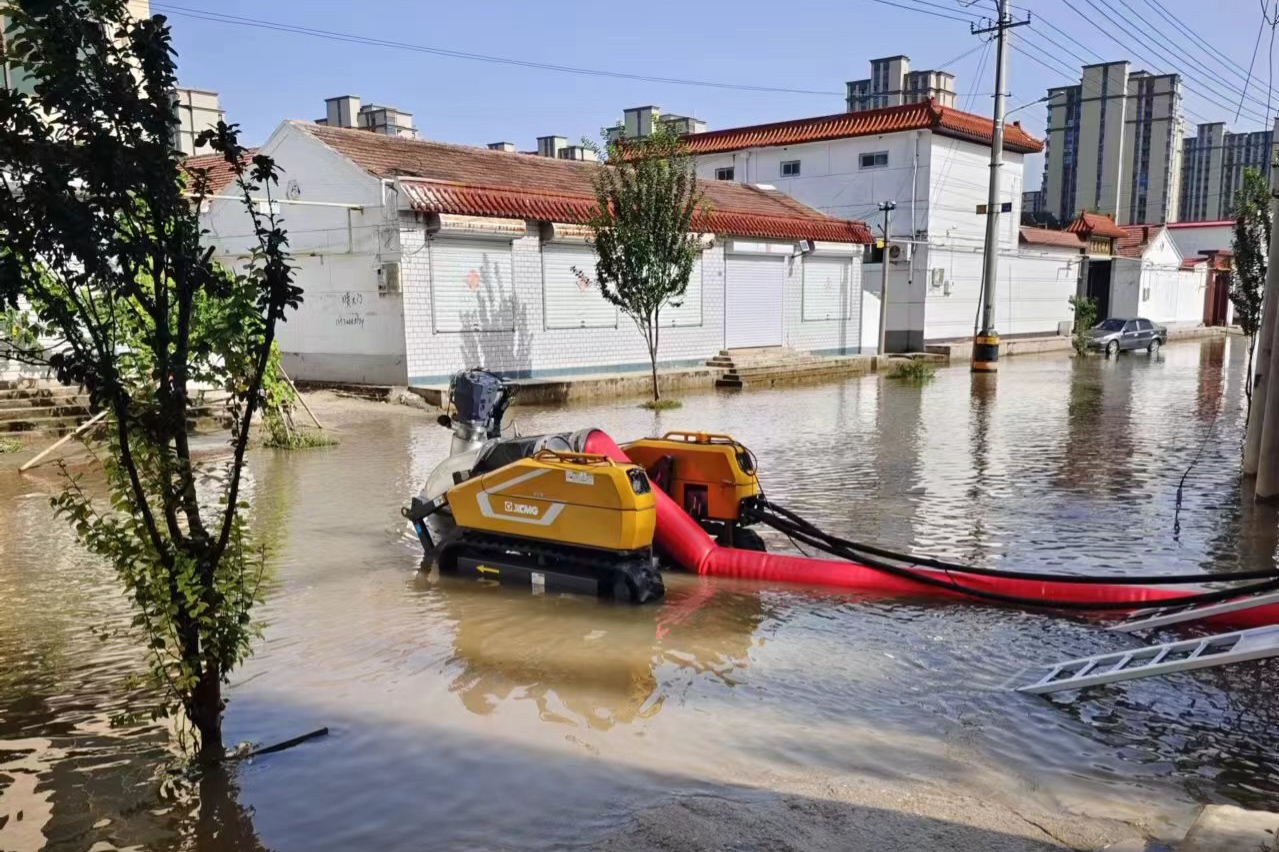 首日,車輛到達(dá)現(xiàn)場后,徐工救援人員立即針對現(xiàn)場環(huán)境制定排水方案。由于場地狹窄,大型救援車輛轉(zhuǎn)彎調(diào)頭不便,最終救援人員決定充分發(fā)揮“子母式排澇車”子車探入作業(yè)與履帶底盤小半徑轉(zhuǎn)彎優(yōu)勢,將母車停至路口,遙控子車帶著120米水帶“穿街走巷 靈活走位”,將積水源源不斷排入下水道。連續(xù)作業(yè)6小時后,PS30F4累計排水超14000立方,因雨勢逐漸增大,第一天救援被迫中止。