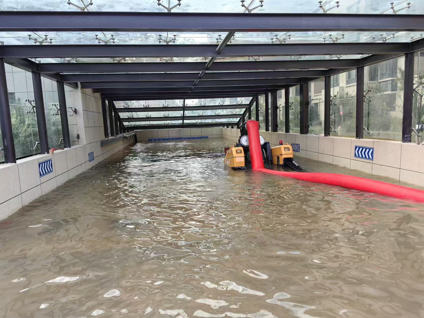 閩泰小區(qū)位于蕭縣龍河街道交通東路,暴雨導致小區(qū)變身“水簾洞”,路面積水已沒人員小腿,迎街地下車庫積水倒灌,出入口已被完全淹沒,近百臺車輛無法轉移,受損嚴重。由于車庫平均寬度僅2.5m,大型救援車輛進出受阻,緊急之際,徐工調派PS50F子母式排澇車趕往支援。