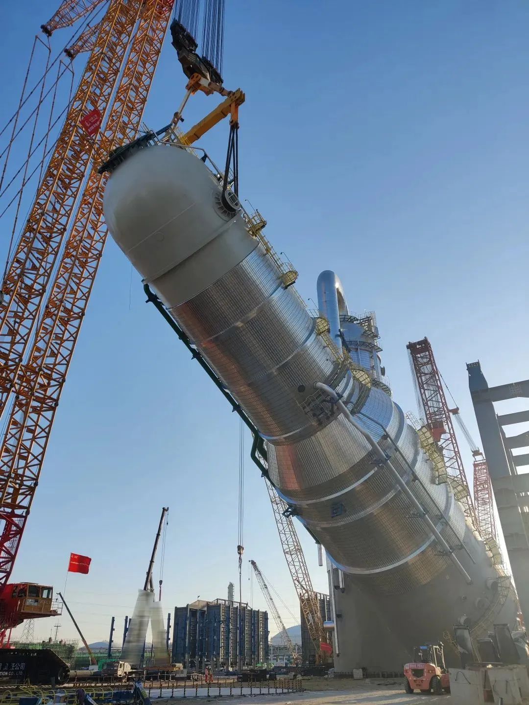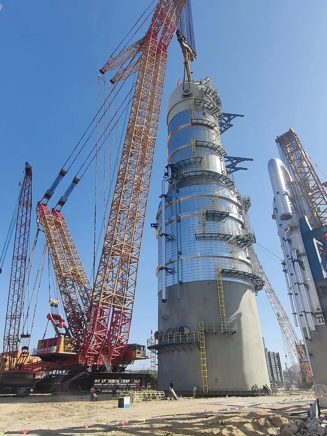 施工現(xiàn)場,XGC88000和XLC17000將“穿衣戴帽”后,總重量達(dá)2000噸的急冷水塔設(shè)備平穩(wěn)吊起并準(zhǔn)確放置到預(yù)定位置,全程行云流水、一氣呵成,僅僅耗時(shí)三小時(shí)。