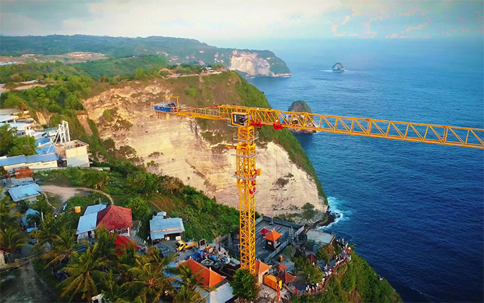 碧藍(lán)海灣、潔白沙灘,在旅游勝地印尼巴厘島,徐工XGT360-20S1屹立在懸崖峭壁之上,眺望懸崖海景和奇特的海岸線景觀,為巴厘島佩尼達(dá)精靈海灘觀光電梯項(xiàng)目注入徐工“動(dòng)力”。