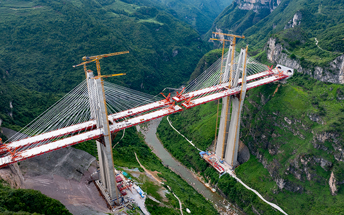 在黔中腹地懸崖峭壁間的烏長高速公路金旗特大橋項(xiàng)目上,徐工群塔與施工升降機(jī)協(xié)同作業(yè),助力世界最高深山峽谷連體斜拉橋建設(shè)。