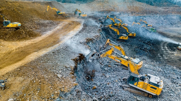 為確保工程節(jié)點(diǎn),施工方經(jīng)多輪方案論證,最終引入了14臺(tái)徐工挖掘機(jī)組成的主力設(shè)備集群,承擔(dān)核心的山體破碎及土石料裝車任務(wù)。在總量高達(dá)300萬(wàn)方的工程面前,徐工XE650GK、XE380K、XE335GK等機(jī)型展現(xiàn)出強(qiáng)大的工況適應(yīng)性。其中,8臺(tái)明星機(jī)型XE650GK配備215型破碎錘,憑借其獨(dú)有的破碎多級(jí)調(diào)頻控制技術(shù),在面對(duì)高硬度玄武巖時(shí)日均破碎量穩(wěn)定在1500噸以上,同時(shí)將油耗控制在約40升/小時(shí),實(shí)現(xiàn)了效率與節(jié)能的出色平衡。