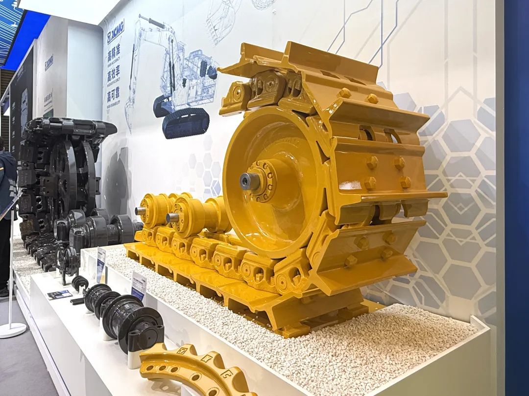 上海寶馬展現(xiàn)場(chǎng),徐工4套成套化履帶底盤產(chǎn)品——400噸挖掘機(jī)履帶底盤、900馬力推土機(jī)履帶底盤、微型挖掘機(jī)履帶底盤、耐高溫、耐極寒工況履帶底盤大放異彩。