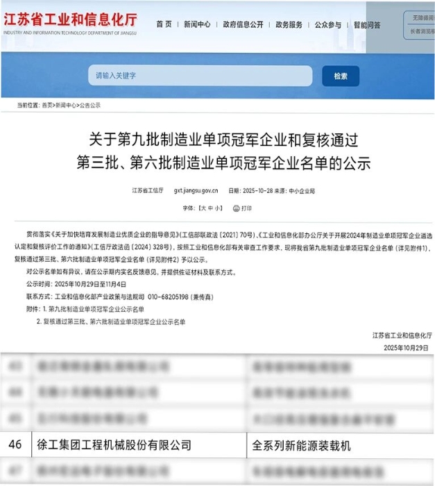 經(jīng)徐州市推薦、江蘇省工信廳評選、協(xié)會專家評審、工信部審核等流程,徐工全系列新能源裝載機入圍“第九批制造業(yè)單項冠軍企業(yè)”名單。