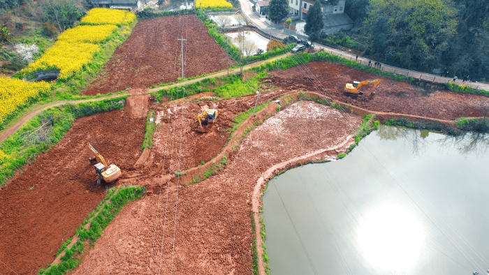 繼續(xù)向東,這里是萬里長江第一城——宜賓,在宜賓江安縣陽春鎮(zhèn),5000畝高標準農(nóng)田建設(shè)進入尾聲,項目高峰期投入30余臺徐工挖掘機。