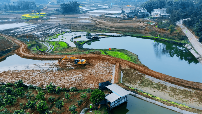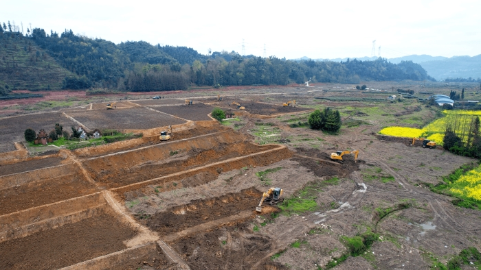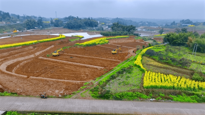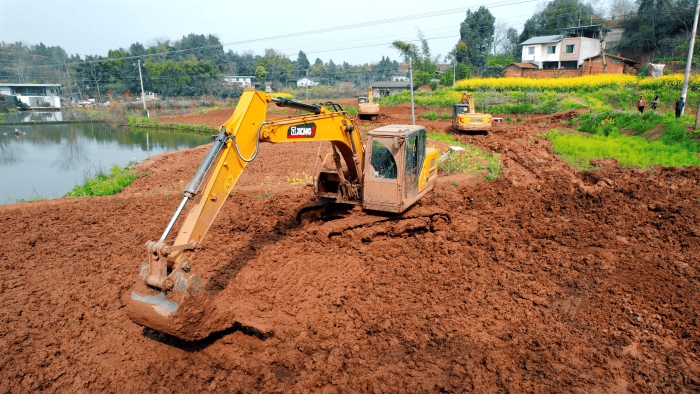 洪雅向東90公里,是仁壽縣,作為四川省產(chǎn)糧大縣,仁壽曾因田塊細碎導(dǎo)致機械化率不足。在5000畝的高標準農(nóng)田建設(shè)中,項目方集結(jié)18臺徐工挖掘機,以“日均30多畝”的速度搶抓工期。