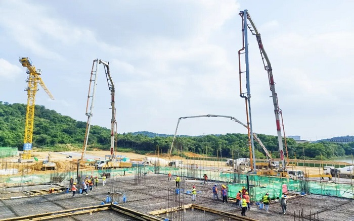 此次澆筑項目為長江軍事主題文化區(qū)-中山艦博物館關(guān)鍵部分,徐工以 “1+2+10+1” 成套化設(shè)備迎戰(zhàn):1臺HB72V、2 臺HB62V大米數(shù)泵車打頭陣,10臺12方新能源攪拌車、1臺XGT7026-12S1塔機組成 “補給梯隊”,展現(xiàn)“1+2+10+1 > 14”的成套化作業(yè)優(yōu)勢。