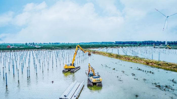 在漁業(yè)較為發(fā)達的濱海港鎮(zhèn),“漁光互補”光伏發(fā)電項目建設正如火如荼,項目現(xiàn)場,徐工水上打樁機的身影隨處可見。