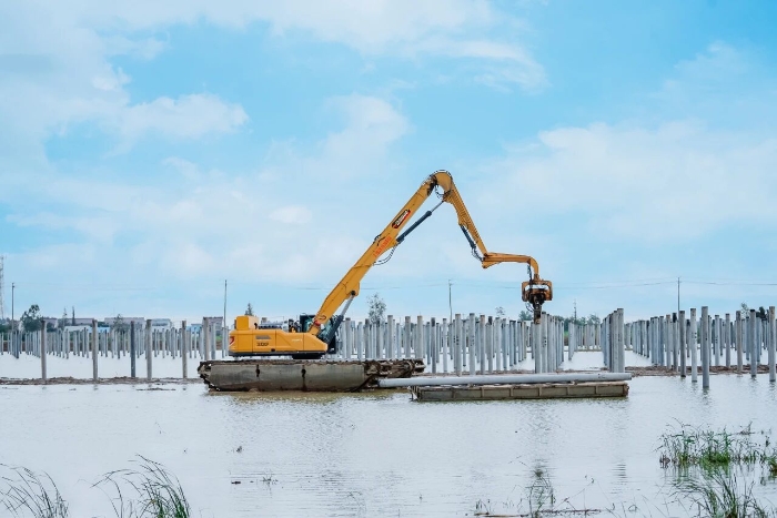 憑借精準的操控、連貫的動作以及強勁的動力,它們將一根根10多米長的混凝土預制樁準確無誤地壓入指定的位置,為后續(xù)支架、組件、發(fā)電板安裝等關鍵環(huán)節(jié)的有序推進“保駕護航”。