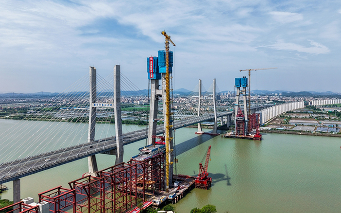 在深江鐵路重難點工程——跨磨刀門水道主橋施工現(xiàn)場,兩臺徐工XGT7527A-18S正穩(wěn)定吊裝,橫梁與對應部位的塔柱同步施工,后續(xù)4臺施工升降機也將陸續(xù)入駐項目,共同助力主橋中、上塔柱爬升施工。