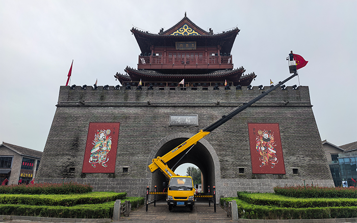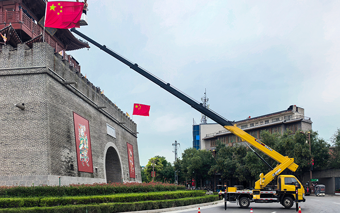 文昌閣前,一抹抹 “中國紅” 悄然升起。徐工 M 系列 GKS32 高空作業(yè)車伸展長臂,穩(wěn)穩(wěn)將施工人員送達(dá)高空作業(yè)點。最大作業(yè)高度32 米,精準(zhǔn)覆蓋建筑立面,轉(zhuǎn)臺 360° 連續(xù)回轉(zhuǎn)間,國旗已平穩(wěn)就位。