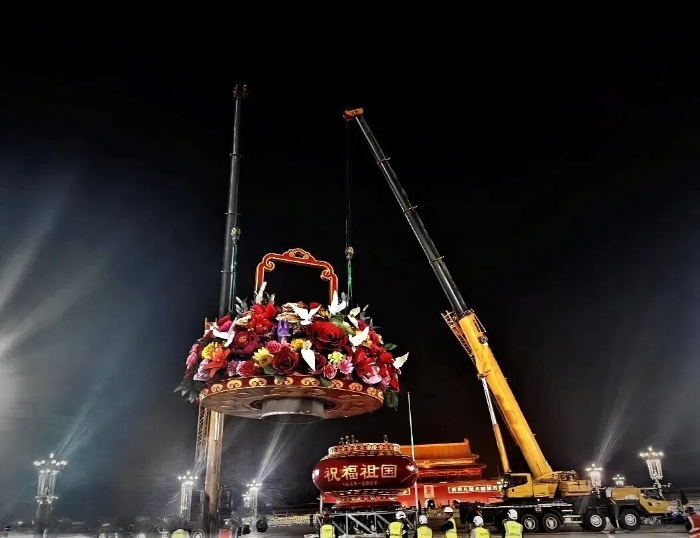 這已是徐工連續(xù)第十五年參與天安門國慶花籃吊裝任務。9月22日凌晨,兩臺徐工200噸級汽車起重機協(xié)同作業(yè),將重達60噸的籃盤平穩(wěn)起吊,與16米高的籃體實現(xiàn)毫米級精準對接。