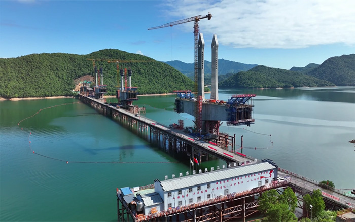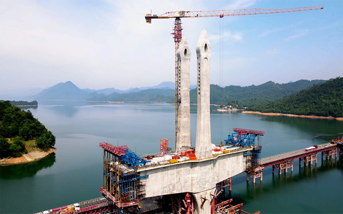 據(jù)項目人員介紹:橋面以上塔高47.23米,每個橋塔設置9對斜拉索,共有箱梁161節(jié)段,最大節(jié)段梁高12米……從吊裝到建造橋塔主體全方位考慮,選擇穩(wěn)定高效,智能精準的設備尤為重要。
