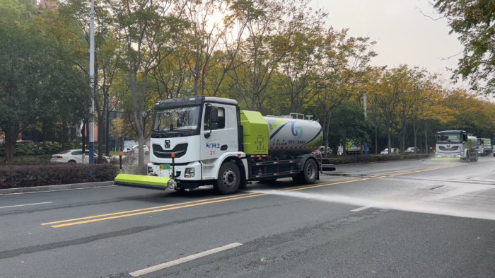 高壓清洗車率先在道路中間作業(yè),以 14km/h 的速度穩(wěn)定行進(jìn)。其采用的三彎對(duì)沖裝置作業(yè)寬度可達(dá)≥24m,能夠輸出強(qiáng)勁水流,將路面上的垃圾、塵土等沖至路沿石附近。同時(shí),配備的流量為 120L/min 的噴水架開啟作業(yè),可有效清洗路面上的陳舊污漬。