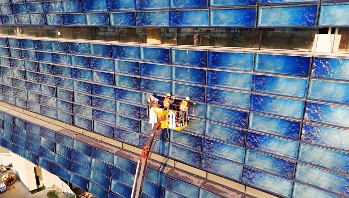 然而,將設(shè)計藍(lán)圖轉(zhuǎn)化為現(xiàn)實,首先面臨的挑戰(zhàn)便是其獨特的外墻施工。建筑立面需安裝上萬塊特制琉璃板,每塊尺寸達(dá)2.5米×1米,重量驚人地接近380公斤,且厚度存在精密的漸變。如此龐大且沉重的建材,對安裝作業(yè)的精準(zhǔn)度、穩(wěn)定性與安全性都提出了極為苛刻的要求。