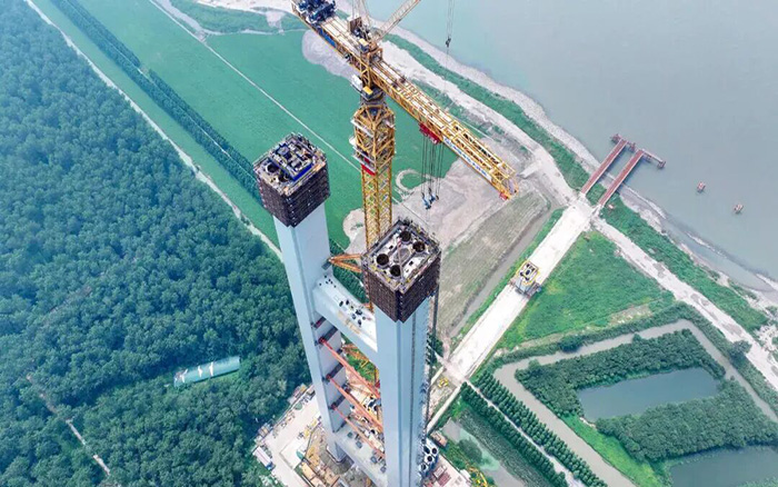 徐工XGT15000-600S采用的創(chuàng)新左右并聯(lián)式、倒三角截面雙臂架結(jié)構(gòu),有效降低江面風(fēng)阻,顯著增強(qiáng)結(jié)構(gòu)剛性,成功攻克“高空精度、抗風(fēng)穩(wěn)性”的施工難題。
