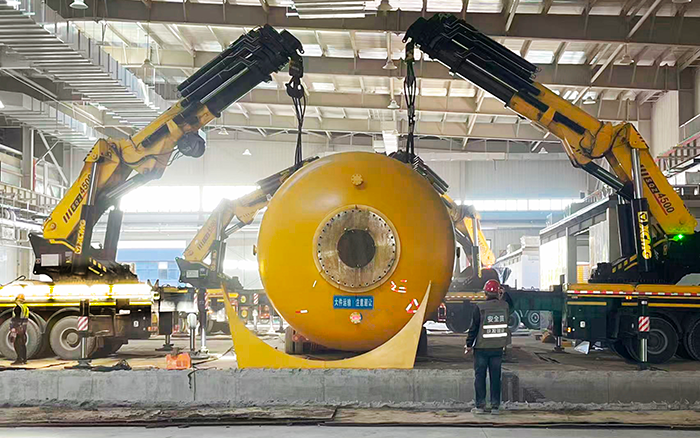 廠房車間層高受限、作業(yè)空間局促,給超大型設備轉(zhuǎn)運帶來極大挑戰(zhàn)。而 SQZ4500C 僅 3400mm 的外形高度,恰好適配低矮工況,無需拆改廠房即可靈活穿梭。其 6 節(jié)伸縮臂(四節(jié)雙推)最長可達 16.2m,具備強大的帶載伸縮能力,配合精準比例控制液壓系統(tǒng),四機協(xié)同實現(xiàn)毫米級走位,讓笨重的高溫爐在狹窄通道中平穩(wěn)前移。