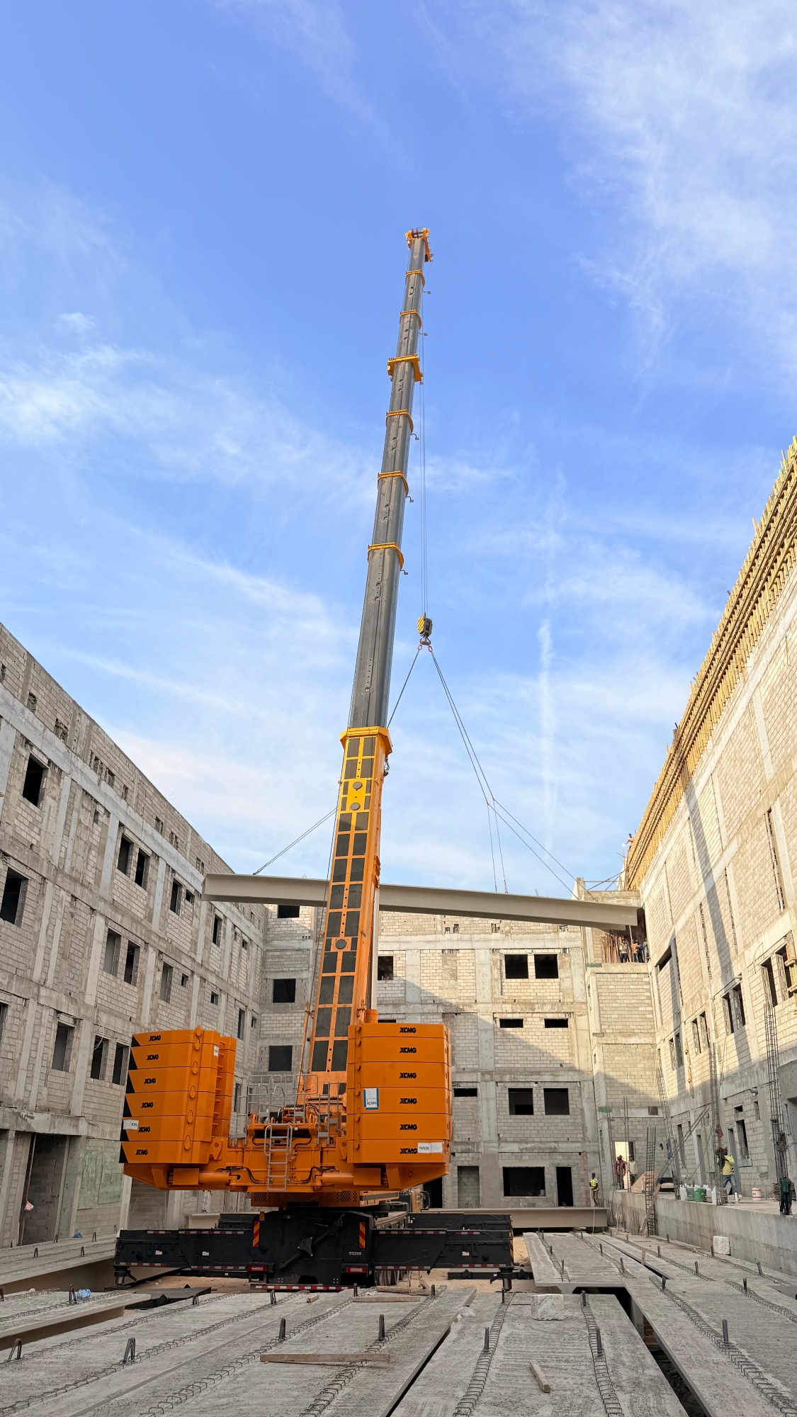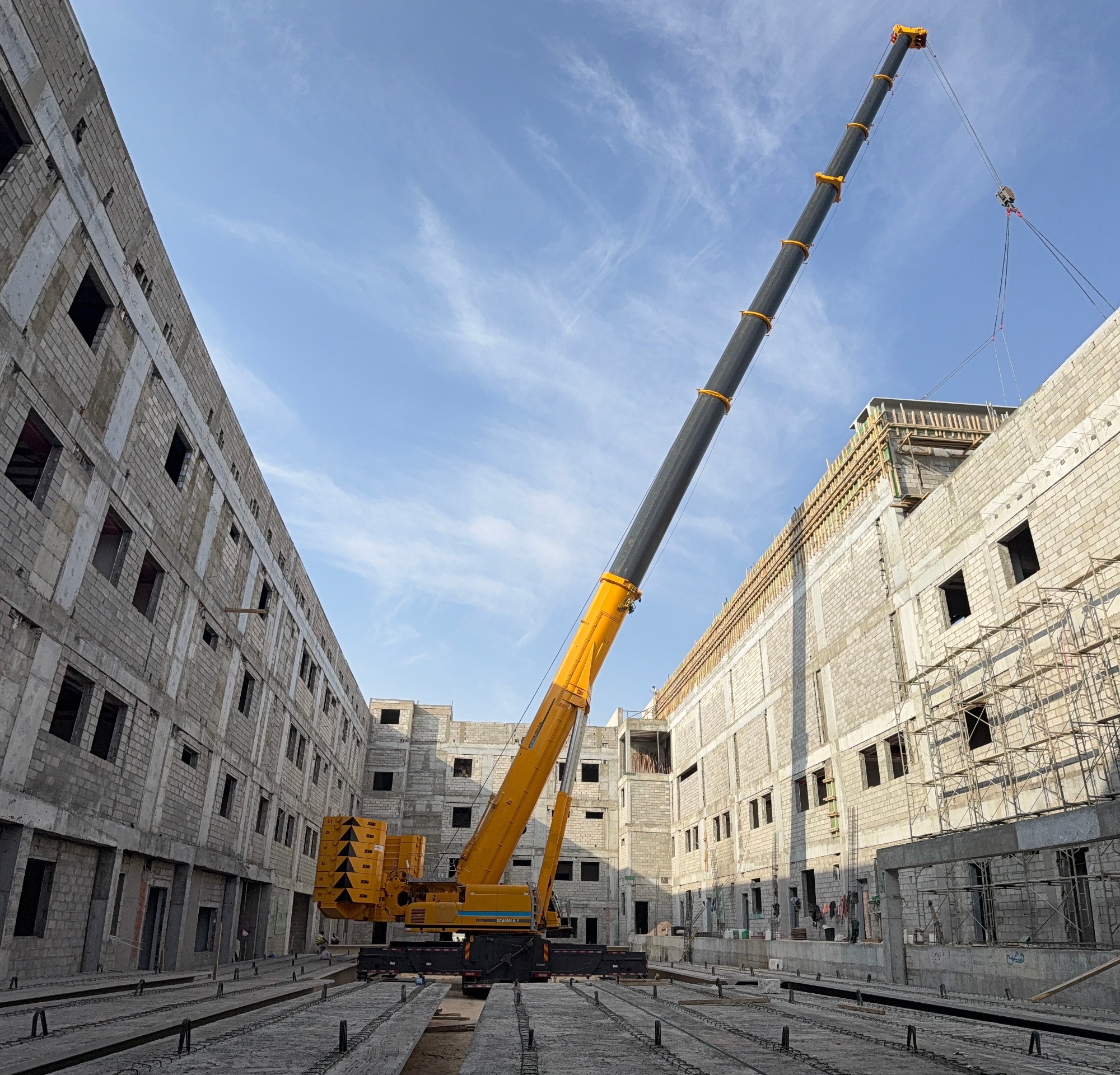 此次施工位于沙特快速發(fā)展的都市區(qū)域,項(xiàng)目本身對(duì)工期與精度有著嚴(yán)苛要求。高層建筑的樓板吊裝,尤其是對(duì)于重量超過(guò)十噸的大型預(yù)制構(gòu)件,不僅是對(duì)起重機(jī)極限載荷能力的考驗(yàn),更涉及在復(fù)雜城市空間中的微動(dòng)操作、抗風(fēng)穩(wěn)定及高空精準(zhǔn)就位等一系列高技術(shù)要求?,F(xiàn)場(chǎng)空間有限,周邊環(huán)境復(fù)雜,對(duì)設(shè)備的機(jī)動(dòng)性、站位適應(yīng)性以及操控的精細(xì)度提出了全方位挑戰(zhàn)。