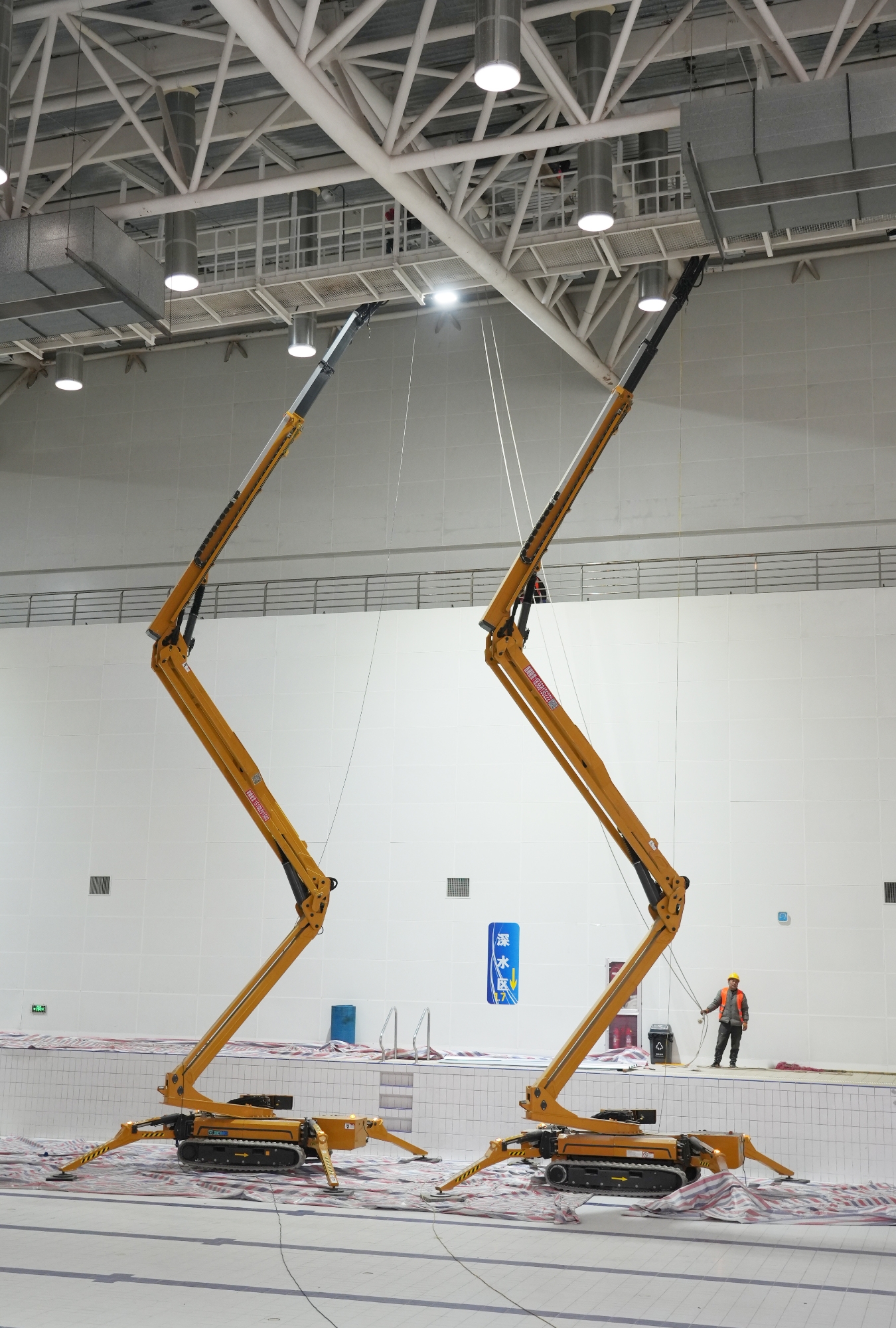 據(jù)悉,該項(xiàng)目策劃伊始,便遇到兩大難題:場地狹窄,入口寬1m高20m,且場館下方為地下車庫,地面承重低,普通臂車無法進(jìn)場;若采用傳統(tǒng)腳手架,需滿架搭建,成本高且工期長。面對如此工況,徐工XGA26X-Li蜘蛛車精準(zhǔn)破局,成為受限空間施工核心利器。